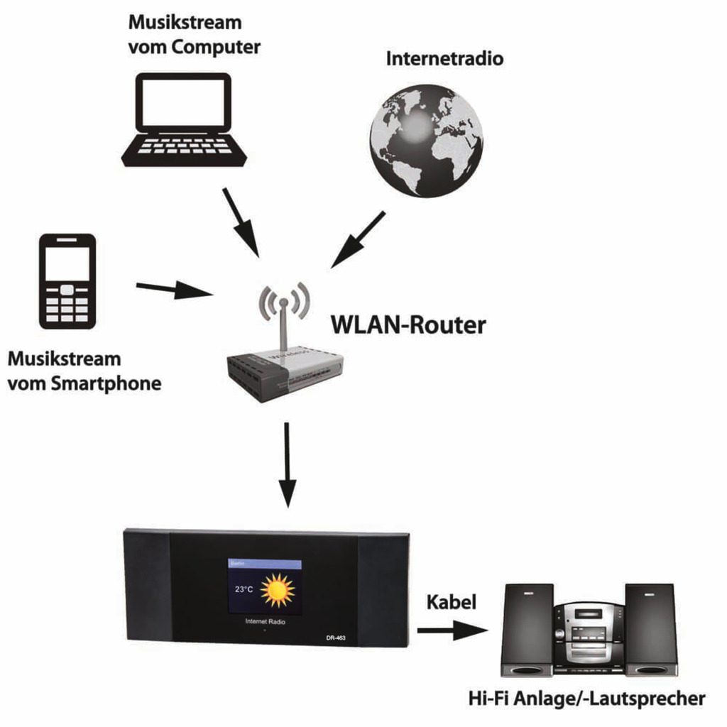 Sintonizador de radio por Internet WLAN para recibir más de 25.000 emisoras de radio por Internet de todo el mundo. Necesitas un sistema estéreo, una conexión a Internet y un router WLAN. El sintonizador tiene una pantalla a color y puede almacenar hasta 250 emisoras de radio por Internet. Fácil uso mediante control remoto o aplicación de smartphone. También es posible reproducir archivos musicales en el sistema estéreo desde tu smartphone o PC.