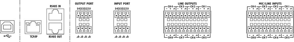 - 8 entradas y 8 salidas (terminales de rosca, conmutable mic/línea, simétricas)
