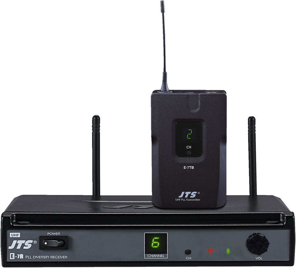 - Emisor de petaca PLL UHF con micrófono de solapa E-7TB/5