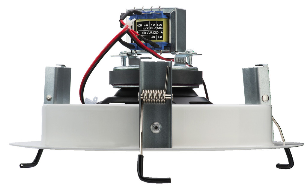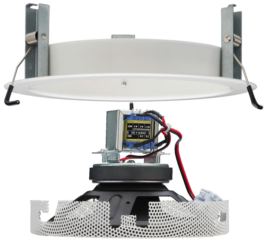 Para el montaje de este altavoz de techo, el cuadro de montaje se ajusta al recorte del techo con sistema Snap-in. A continucación, se monta el altavoz en el cuadro, con un cierre de bayoneta. Como seguro adicional está la cuerda de seguridad.