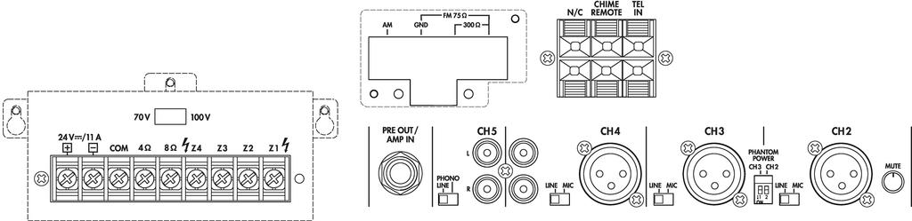 Durante su uso, en las conexiones de los altavoces puede haber una tensión peligrosa de hasta 100 V. Realice o cambie las conexiones siempre con el amplificador apagado.
