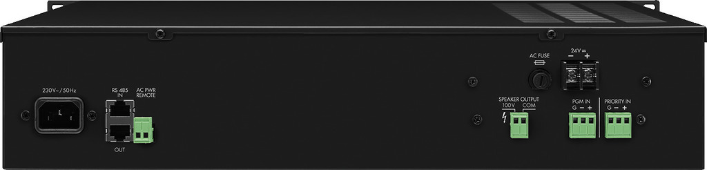 El amplificador para megafonía mono de clase D PA-1250D forma parte de una nueva generación de material que combina gran potencia y eficiencia energética, contribuyendo así a la protección del medioambiente. Además, el usuario también puede ahorrar en el coste eléctrico. Entre otras cosas, esto se debe a que el amplificador de 100 V digital ofrece una eficiencia muy superior de más del 90% en comparación con otros aparatos analógicos (70% aprox.). Por lo tanto, la pérdida térmica es muy inferior. De este modo, los requisitos para la refrigeración se minimizan y se aumenta la duración del PA-1250D.
