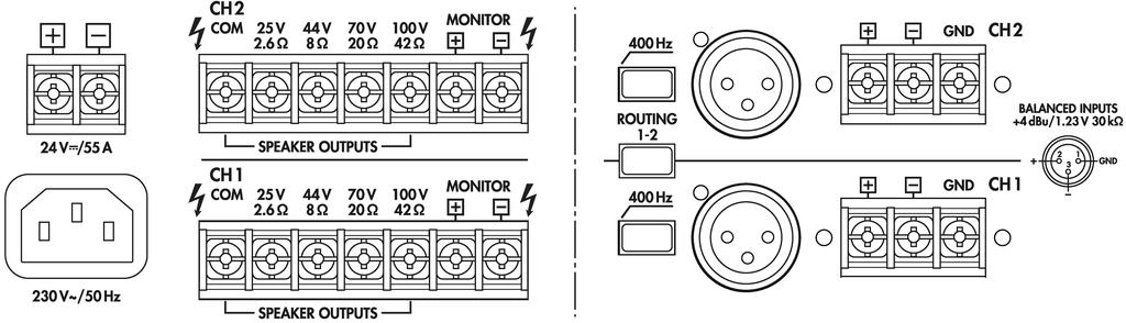 - Filtro pasa alto 400 Hz conmutable 6 dB/oct.