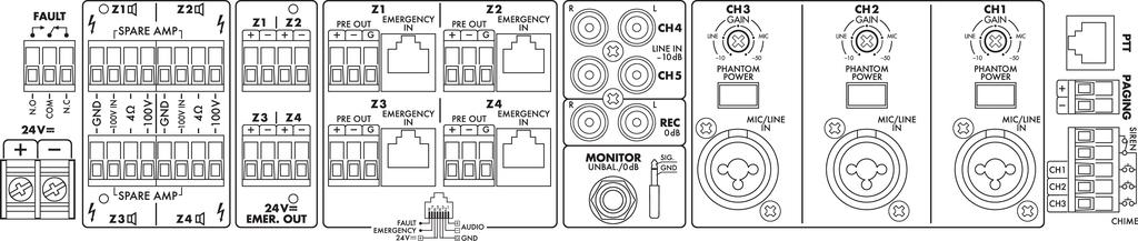 Con el micrófono de control opcional PA-4000RC, el amplificador puede ampliarse a un sistema de llamada de 4 canales. En combinación con la memoria de voz integrada, se puede crear, por ejemplo, un sistema de alarma para colegios.