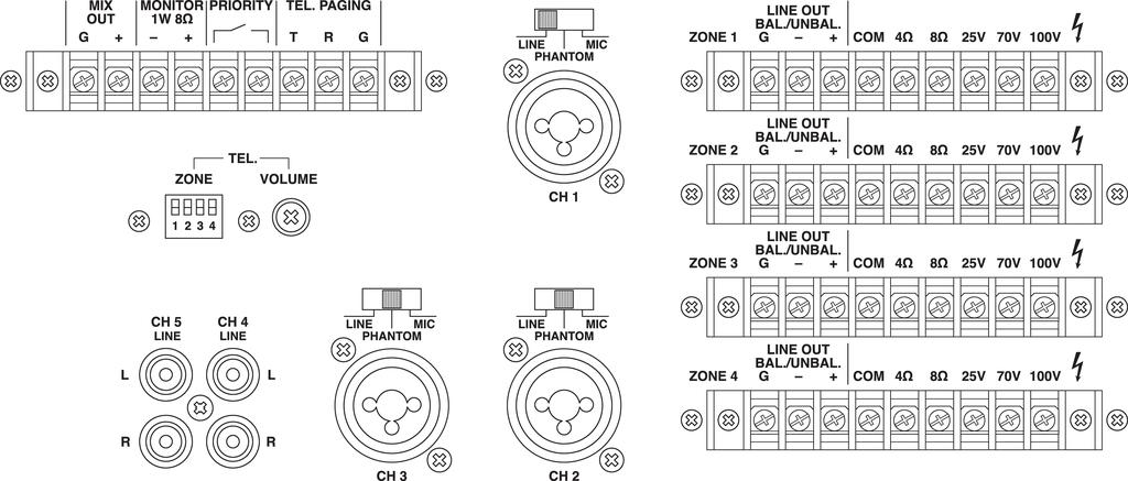 - Cada canal de entrada tiene control de ganancia, control de tono de 2 vías, silenciamiento de canal conmutable y interruptores de direccionamiento para las zonas