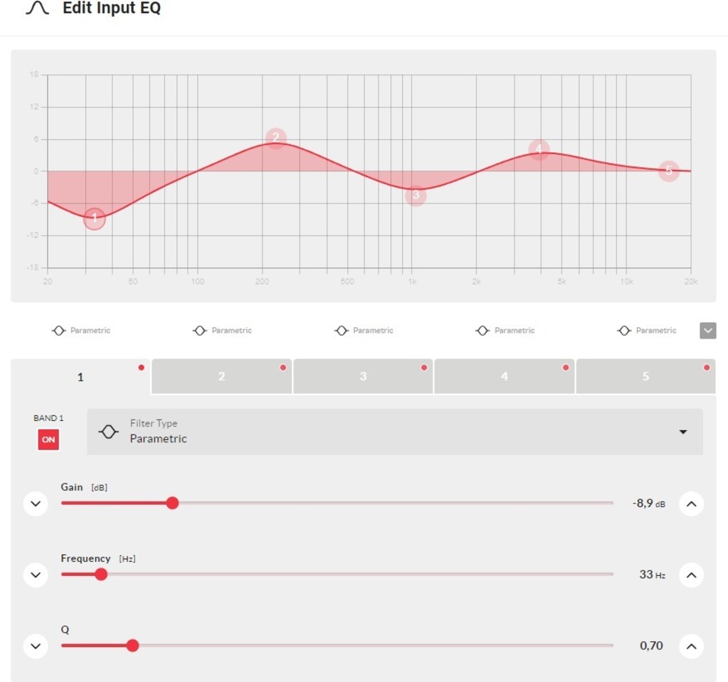 - Ecualizador paramétrico de 5 bandas para la entrada