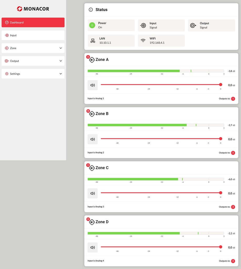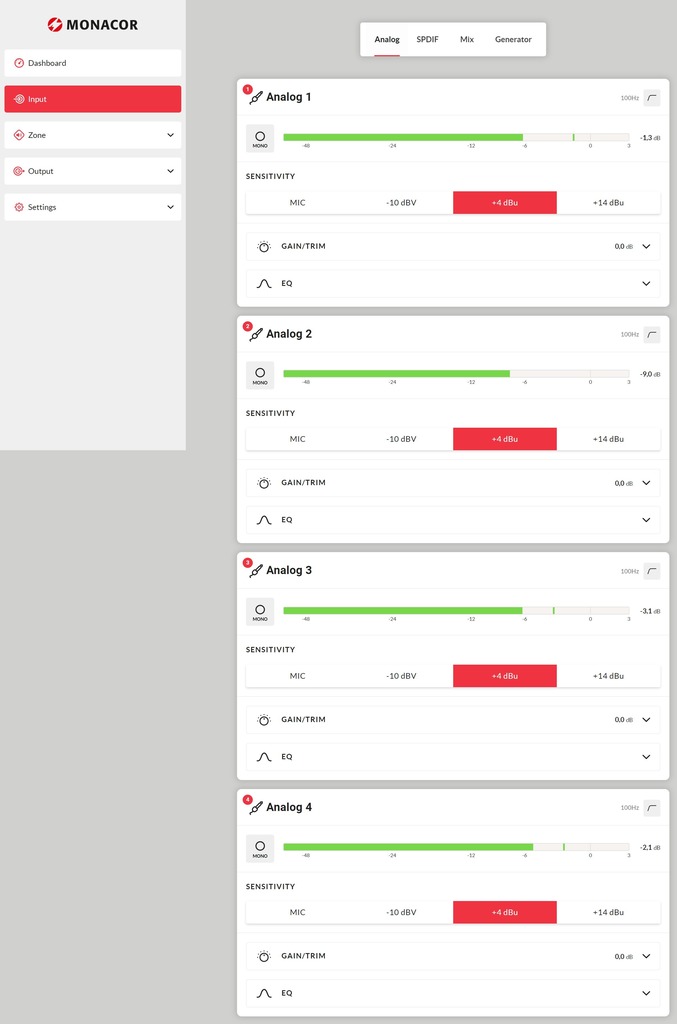 - Zona de 4 x 125 W (4/8 Ω) o 2 x 250 W (100 V)