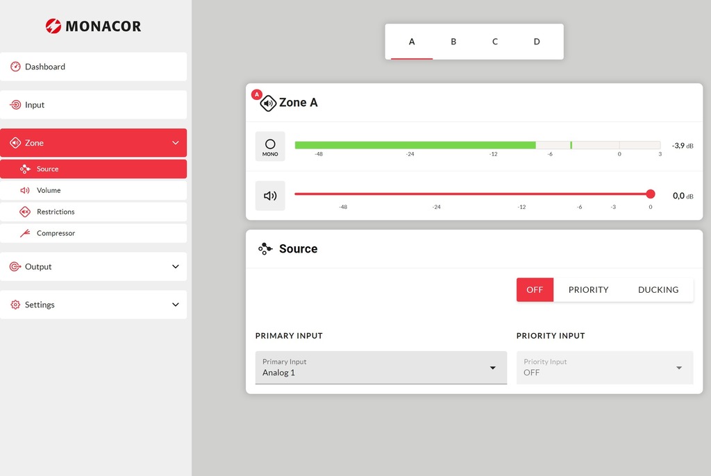Amplificador multifunción de 4 zonas compatible con Dante®