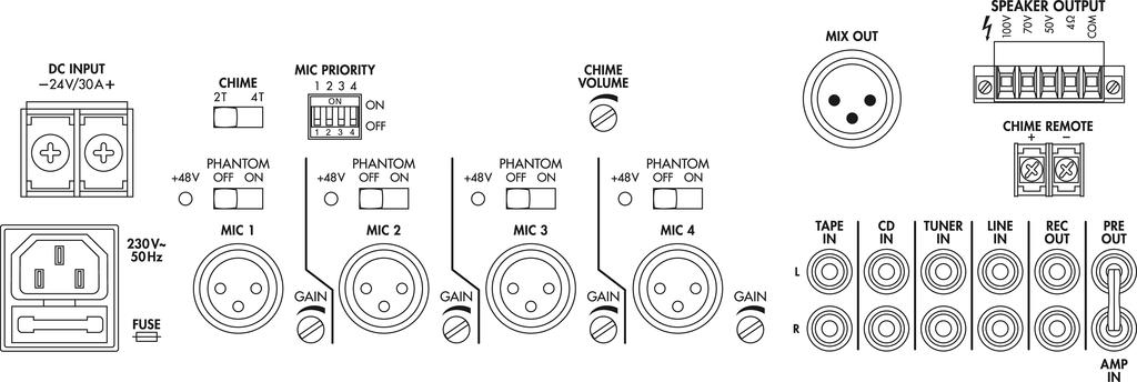 - 4 entradas de micrófono simétricas y entradas de línea con prioridad seleccionable