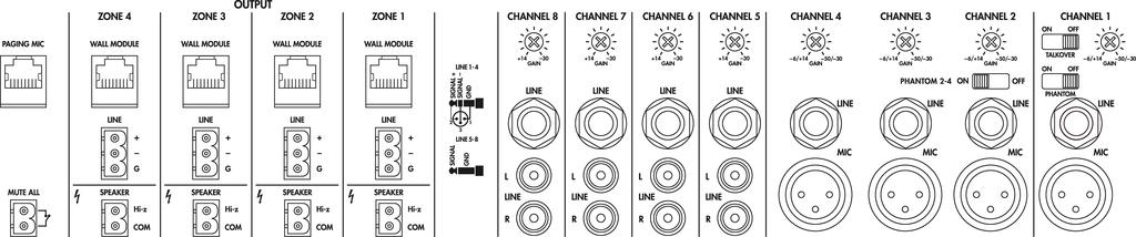 - 4 entradas de micrófono/línea regulables con ecualizador de 3 bandas y phantom de 24 V, se pueden activar según convenga