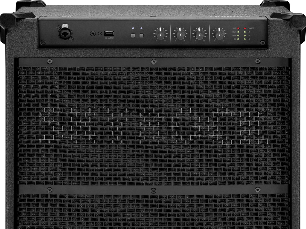 - Funcionamiento mediante conexión a la red eléctrica o batería de plomo-gel integrada de 12 V/18 Ah (hasta 40 horas de uso a volumen ambiente y 10 horas de uso a plena capacidad), con indicador LED de estado de carga