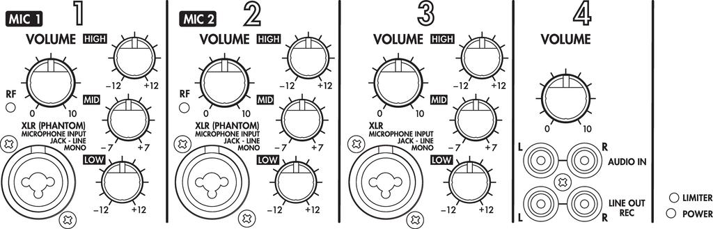 - 3 entradas mediante toma combinada mic (XLR) / línea (jack 6,3 mm), cada una con ecualizador de 3 vías y control de ganancia