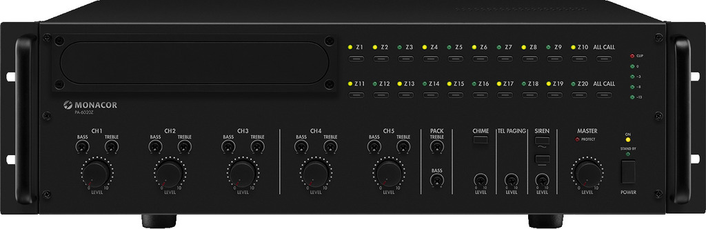 Amplificador mezclador de 480 W para megafonía mono de 6 zonas