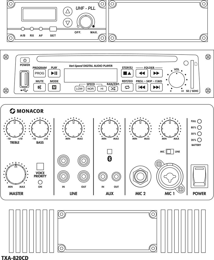 con receptor multifrecuencia integrado de 1 canal con tecnología PLL UHF y receptor Bluetooth.