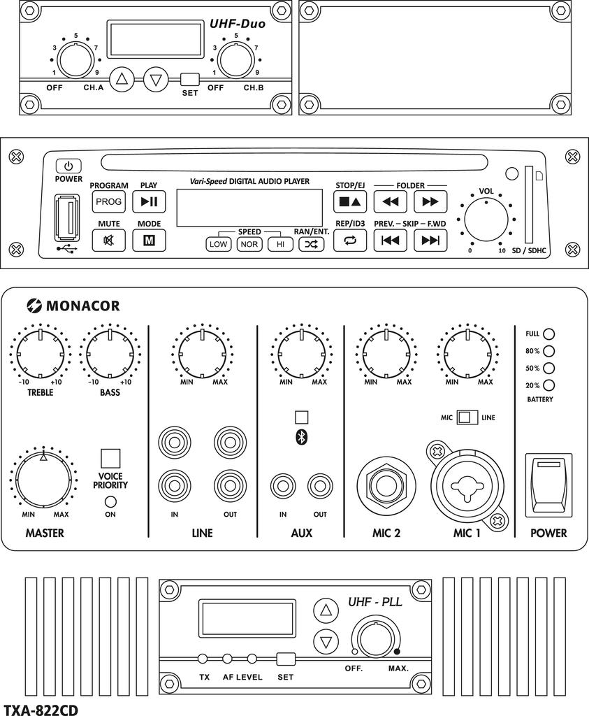 El emisor inalámbrico integrado del TXA-822CD y del TXA-1022CD transmite señales de audio a uno o varios sistemas TXA-820 o TXA-1020. Es ideal para megafonías grandes en interiores que necesiten una radiación consistente del sonido.